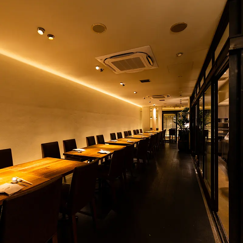 キッチンはガラス張りになっており、水剌間の名の由来である、活気溢れる厨房を見渡せるテーブル席。